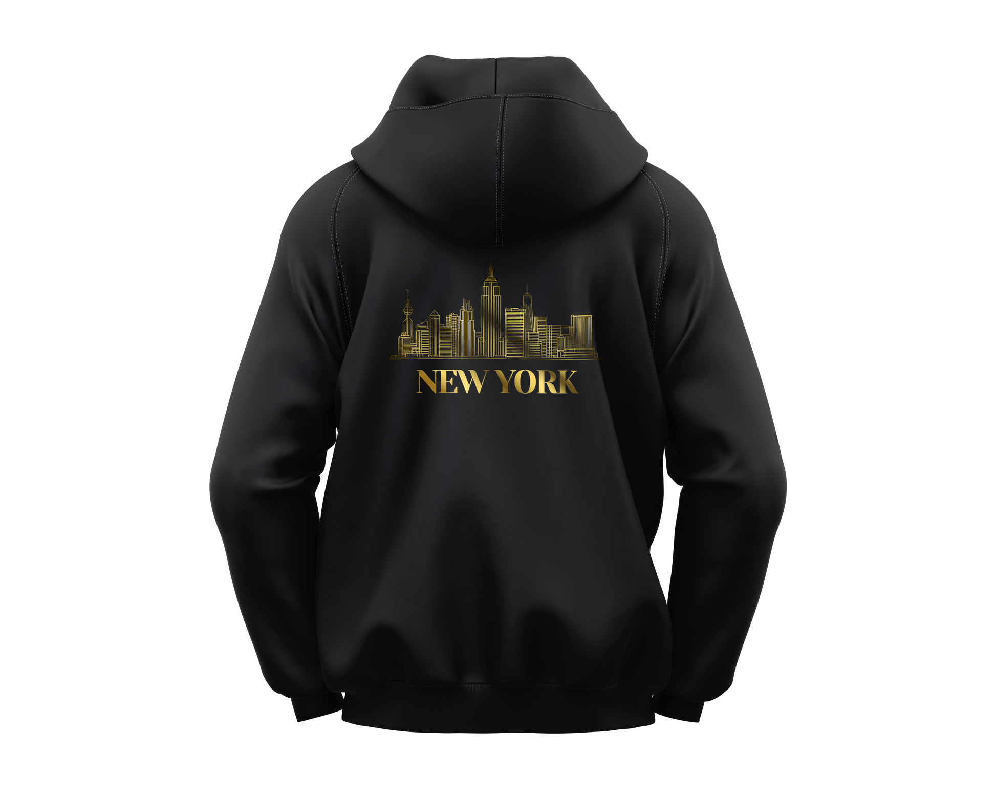 Crafted from premium cotton-blend fleece, it delivers warmth without the weight, featuring a custom gold skyline design on the back and signature crown emblem on the front — representing leadership, power, and legacy.